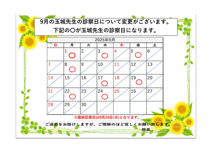 令和7年9月の玉城先生診察日のお知らせ