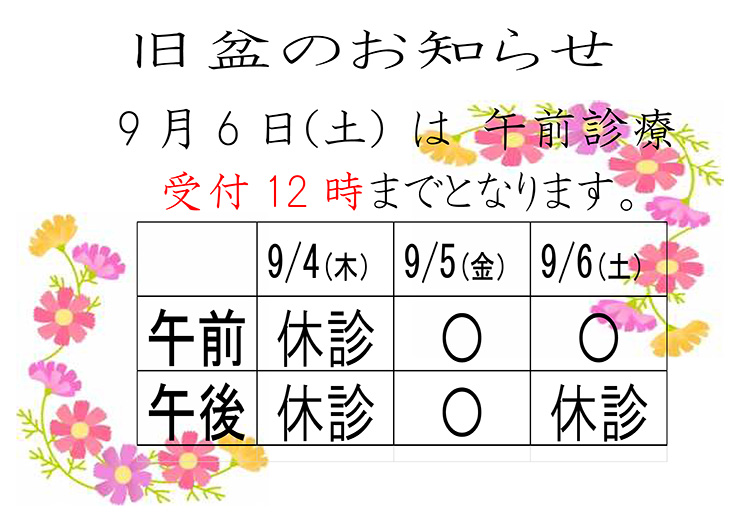 旧盆期間中の診療体制のお知らせ